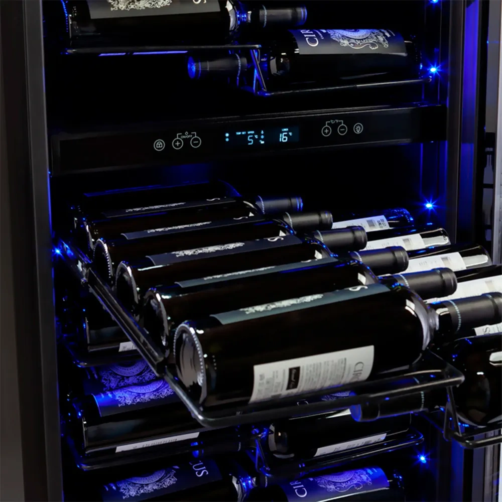 Seu acabamento em vidro triplo Low-E protege contra variações externas e raios UV, enquanto o filtro de carvão ativado mantém o interior puro e livre de odores. A iluminação interna valoriza os rótulos com destaque sutil e sofisticado.