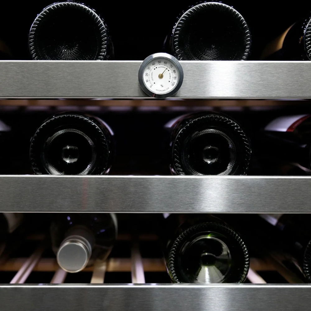 Seu sistema de climatização por compressor assegura estabilidade térmica mesmo em ambientes mais exigentes, enquanto as prateleiras em madeira tratada anti-fungo com frisos inox e corrediças telescópicas garantem acesso fácil e seguro aos rótulos.
