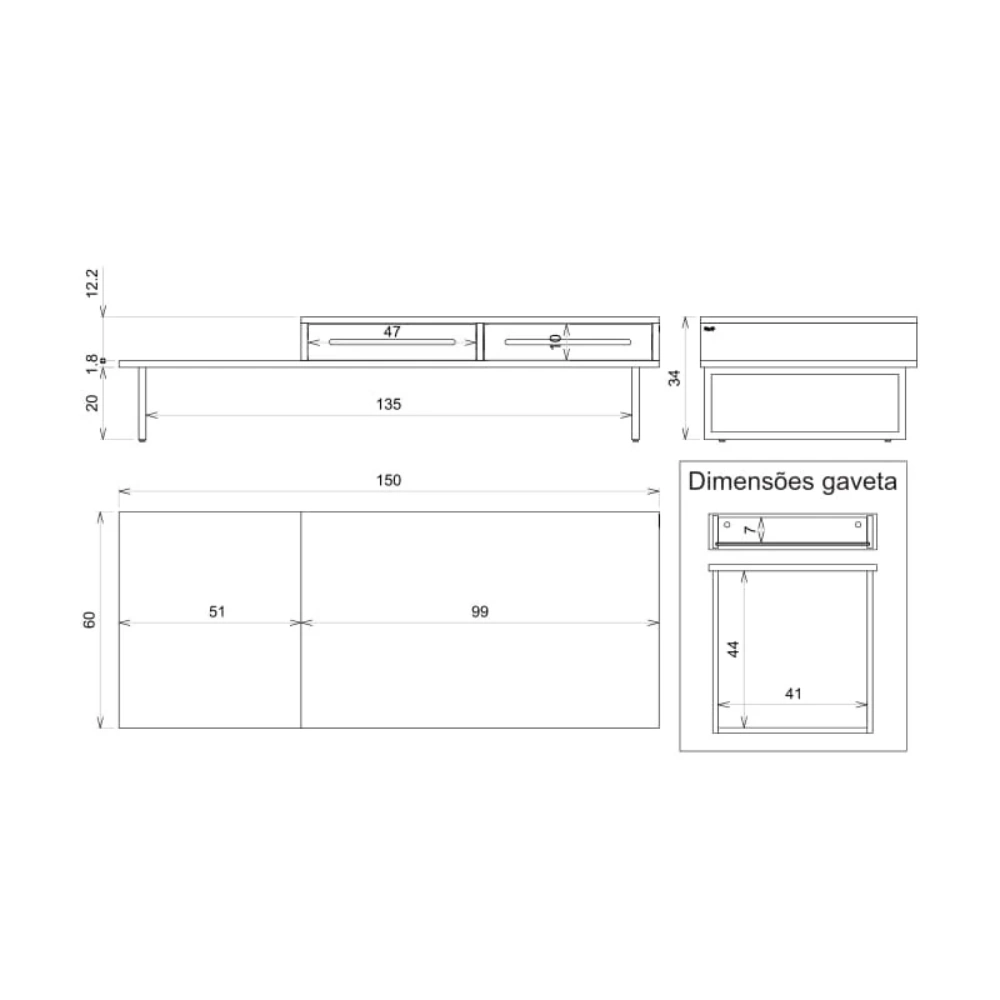 Pés metálicos, que garantem leveza e estabilidade