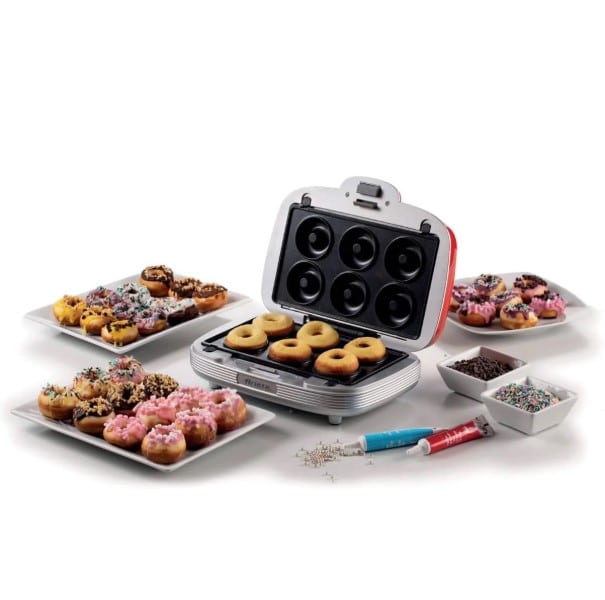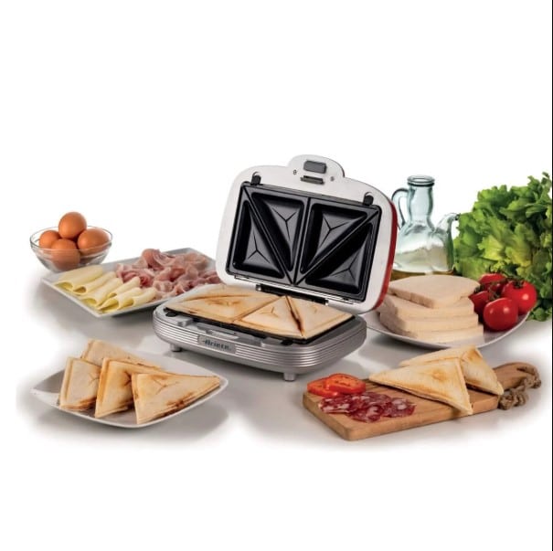 A Sanduicheira Ariete 1972 Party Time 3 em 1 Retrô 700W Vermelha é um eletroportátil versátil e estiloso que permite preparar sanduíches, muffins e donuts deliciosos, com um design que remete aos anos 50.